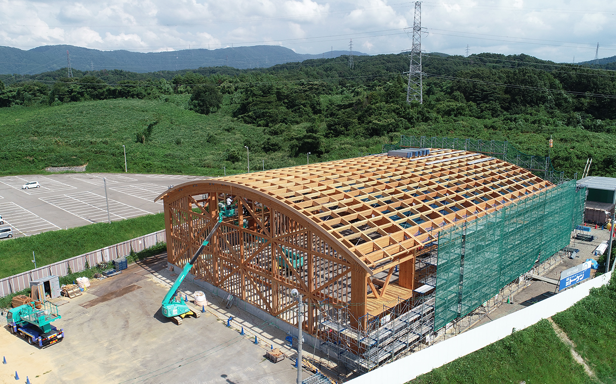 木材を積極的に活用し、温かみ・親しみを感じることができる空間を創出。アリーナ大空間は1.5mの積雪に耐える国産カラマツの大断面集成材にて構成。キャットウォークの床は県産材の杉CLTとするなど多くの木材を活用。